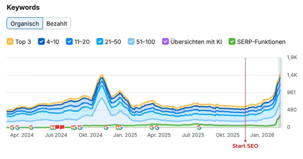 Die Impressionen stiegen von rund 4.000 auf 10.000 pro Tag, also ein Wachstum von +150 %. Die täglichen Klicks aus der organischen Suche wuchsen von 80 auf 150. Ein Plus von +88 %. Am deutlichsten zeigt sich der Fortschritt bei den rankenden Keywords: von rund 500 auf knapp 1.500 (eine Verdreifachung in unter drei Monaten).
